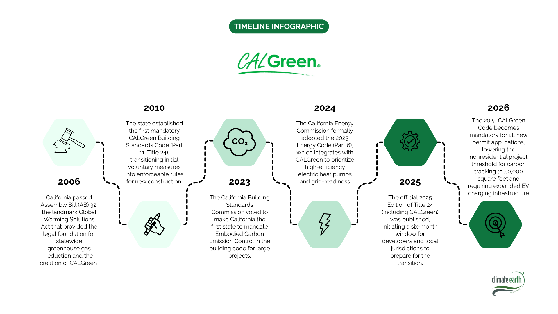 • 2006: California passed Assembly Bill (AB) 32, the landmark Global Warming Solutions Act that provided the legal foundation for statewide greenhouse gas reduction and the creation of CALGreen .